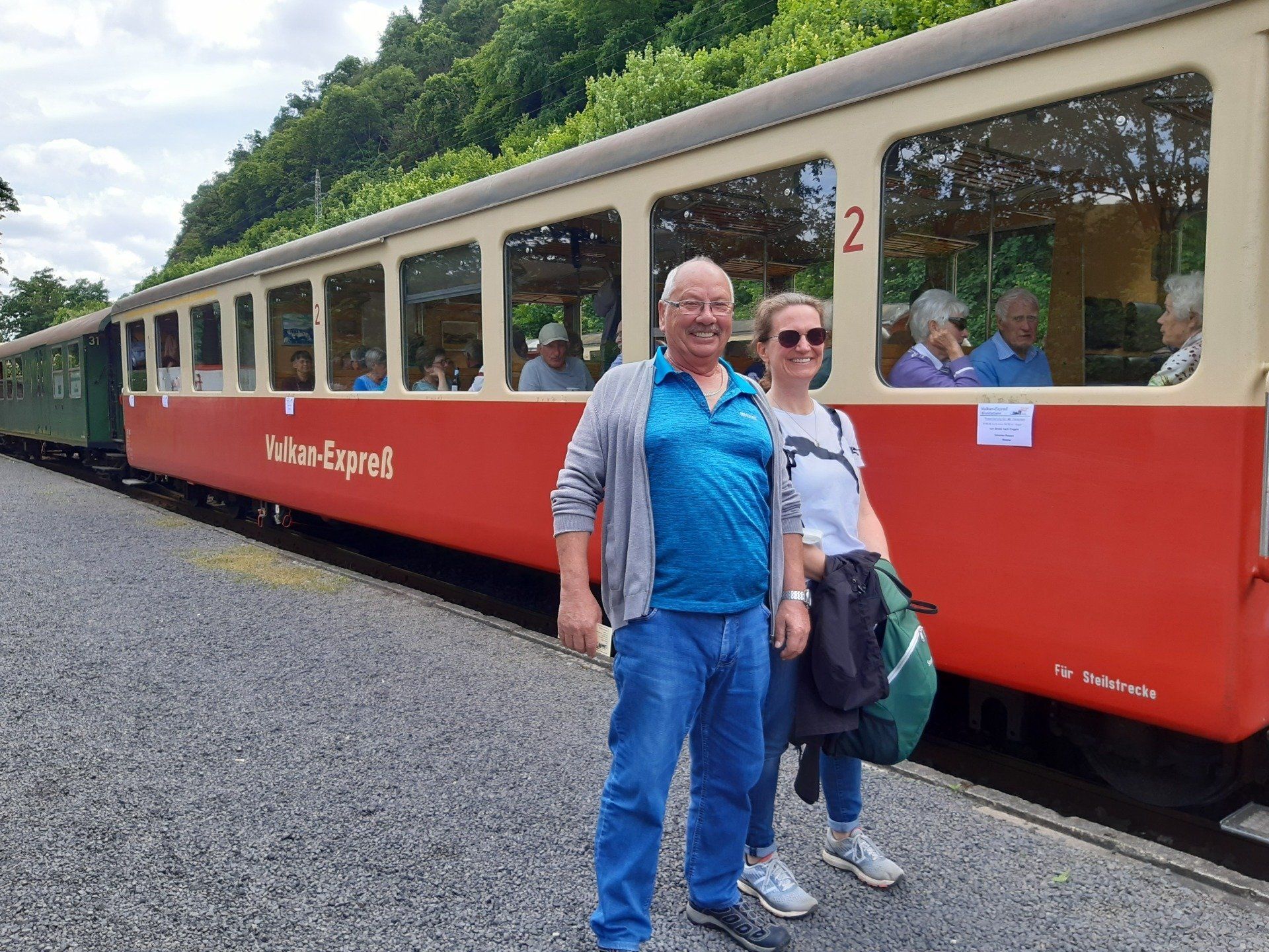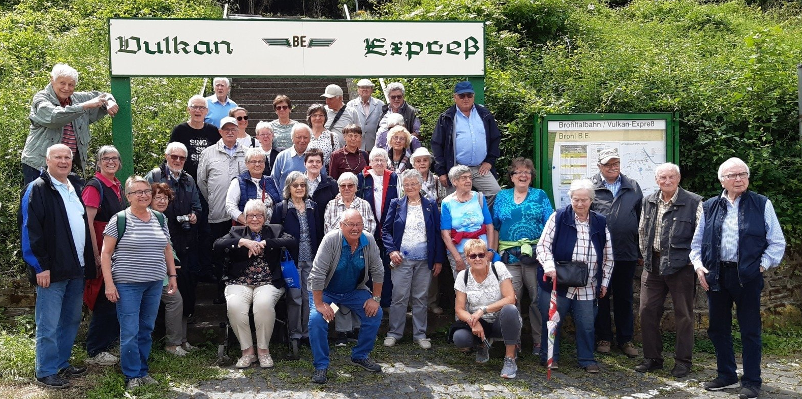 Seit zwei Jahren war er geplant, nun konnte er endlich durchgeführt werden: der Tagesausflug des Gesangvereins Germania Heuchelheim mit dem Ziel Osteifel. Bei bestem Ausflugswetter starteten über vierzig Freunde und Mitglieder des Vereins aus Traditionschor Germania, dem Chor GoSpirit und der Volksliedergruppe in Heuchelheim. Ziel war zunächst das Kloster Maria Laach. Während der zweistündigen Anfahrt erhielten die Reisenden allerlei interessante Informationen. Gerhard Henkelmann berichtete über geologische Entwicklungen der Gemeinde Heuchelheim an der Strecke und über historische und persönliche Ereignisse. In Maria Laach angekommen konnten die Teilnehmenden nach einer Kaffeepause am Bus in Eigenregie die Gegend erkunden. Neben der Besichtigung der romanischen Benediktinerabtei nutzten viele die Zeit für einen Spaziergang am Laacher See, zu einer Tretbootfahrt auf dem See oder für ein individuelles Mittagessen. Im Anschluss fuhr die Gruppe mit dem Vulkan-Express, einer Museumseisenbahn, die ursprünglich zum Abtransport von Vulkangestein erbaut wurde, von Brohl im Rheintal nach Engeln in der Eifel. Die Gruppe erlebte so ein echtes Technik- und Naturerlebnis mit der Schmalspurbahn, die Einblicke in die einzigartige Vulkanlandschaft der Osteifel ermöglichte. Mit einem gemeinsamen Kaffeetrinken und leckerem Kuchen endete dieser Teil des Ausflugs und man konnte gemeinsam die Rückfahrt antreten. Spontan reagierte der Busfahrer des Veranstalters Gimmler auf die Anregung der Vereinsmitglieder, auf der Rückfahrt entlang des Rheintals zu fahren und auf diesem Weg neue Eindrücke wie beispielsweise das Deutsche Ecke oder die Festung Ehrenbreitstein zu erleben.